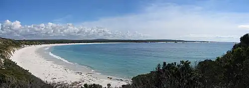 The Bay of Fires is a region of white beaches, blue water and orange-hued granite (the colour of which is actually produced by a lichen). The northern section of the bay is part of Mount William National Park; the southern end is a conservation area.[5]