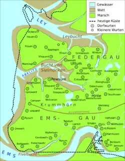 The Bay of Sielmönken was situated between the Dollart and the Leybucht on the terrain of the present-day municipality of Krummhörn, with a small portion on the territory of Hinte. In the Early Middle Ages it separated the historical regions of Emsgau and Federgau.[2]