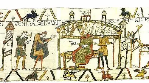 - ^ The Bayeux Tapestry scholar Lucien Musset argues that "Edward" is anachronistic (as his name is spelled elsewhere on the tapestry as "Eadwardus") and that it was almost certainly added by restorers, given that the name is missing in 18th century copies.[11]