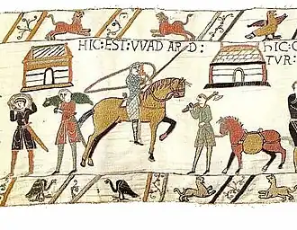 The content of the hanging is primarily pictorial but tituli are included on many scenes of the action to point out names of people and places or to explain briefly the event being depicted.[5] The text is in Latin (which for the most part is grammatically correct), and is extremely direct, with each statement being closely tied to the scenes depicted in a given section.[6][7] The text is frequently abbreviated as indicated by tildes placed over words at the place of omission of a letter. The words themselves are often demarcated by two points (which Lucien Musset likens to colons); sometimes, more important section breaks are demarcated by three points. Many personal names, mostly in English, are not Latinised and the same applies for names of places in England and for Beaurain "Belrem" in France. In places the spelling shows an English influence, such as the phrase "at Hestenga ceastra", which in proper Latin would be "ad Hastingae castra".[6] Some French names are either archaic ("Rednes") or anglicised ("Bagias").[8] Sometimes "Franci" is used to describe the Normans and the rest of the host.[9]