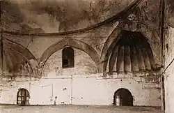 The hamam is one of the largest in the city[6] and is considered a good example of hamam design in the era of classical Ottoman architecture.[3] Its monumental appearance from the outside and its tall entrance portal earned it the name Hamam-ı Kebir ('Grand Bathhouse').[4][3] It is a double hamam, meaning that there are separate facilities for women and men. Each side consisted of an enormous domed chamber, the camekân (undressing room; also referred to as the cold room or soğukluk), an ılıklık (warm room or intermediate room) and a hararet (hot room).[10][5] The women's camekân is slightly smaller than the men's. The dome of the men's camekân has a diameter of 15 meters.[3] The warm room consists of a three-winged room with a central dome and three other domes arranged at right angles around it, with two other rooms in the corners between them. The hot room has a similar layout but with four instead of three wings, arranged in a cross, each with a dome, and with another domed room in each corner. The camekan's domes have grooved squinches, the warm room's domes have muqarnas squinches, and the hot room's domes have pendentives with arabesque-like carvings. The interior featured carved stucco decoration similar to earlier examples in Edirne, with some of the original decoration remaining in the corners of the domes.[3]