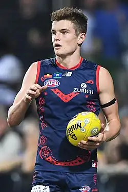 Bayley Fritsch (born 6 December 1996) is a professional Australian rules footballer playing for the Melbourne Football Club in the Australian Football League (AFL). A forward, 1.88 metres (6 ft 2 in) tall and weighing 84 kilograms (185 lb), Fritsch has the ability to play as both a high marking and small crumbing forward. Considered a late bloomer, he missed out on selection with the Eastern Ranges in the TAC Cup as a junior. After winning the league rising star in the Eastern Football League, he joined the Casey Scorpions in the Victorian Football League (VFL) where he spent three seasons. The 2017 VFL season saw him win the Fothergill–Round Medal, play for Victoria in the state representative match, be named in the VFL Team of the Year, and finish runner-up in the league-leading goalkicker and Casey's best and fairest award. His season saw him drafted by the Melbourne Football Club in the second round of the 2017 AFL draft and he made his AFL debut in the opening round of the 2018 AFL season.