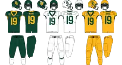 The traditional Baylor uniform worn for home games consists of a gold helmet with a green interlocking BU logo on the sides and green & white stripes down the middle, green jersey, and white or gold pants; a white jersey is substituted for the green one for road games. In recent seasons, both a matte green helmet and a white helmet have been used as alternates to the gold helmet. Black jerseys as well as black or green pants have also been used giving the Bears multiple uniform combinations to choose from.