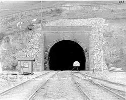 By May 1905, good progress was being made, as workers excavating the tunnel had found "nothing harder than sand and earth", but they were forced to wear rubber clothes due to the damp conditions.[36] Two shifts of work were started in June, and the stone blocks to be used in the portals had arrived at Tunnel 5.[37] By July, work on the final tunnel (later designated Tunnel No. 3) had started, and SP General Manager E.E. Calvin confidently predicted all tunnels would be completed in 1906.[29] Heavy rain during February 1906 damaged the roadbed between South San Francisco and San Bruno when the final stages of construction were about to commence.[38]