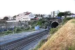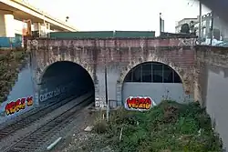 Tunnels 1 and 2 bracket the present-day 22nd Street station. Tunnel 1 is just north of the station, and Tunnel 2 is south. Both tunnels are cut through Potrero Hill. Tunnel 2 is the only one of the five tunnels built with twin bores to accommodate four tracks, although the western bore is currently closed. The western bore was built because a high concrete retaining wall was needed to support a city street running alongside that second tunnel.[1] Tunnel Top Park, at 1100 Pennsylvania Avenue, is within the Caltrain-owned right-of-way. These two tunnels were bored through mostly serpentinite rock with clay seams.[1]