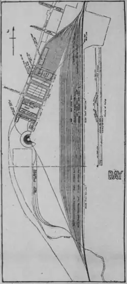 The Bayshore Yard contained approximately 50–65 miles (80–105 km) of track, in an approximately triangular area bounded by the Bayshore Cutoff main line (on the east), the Bayshore Highway (on the west, now Bayshore Boulevard), Tunnel 4 (on the north), and the deep cut at Visitacion Point (on the south).[7] It extended 8,400 feet (2,600 m) in length, measured north to south, and 1,800 feet (550 m) wide east to west at the apex of the triangle.[23][24] An additional 18.2 miles (29.3 km) of track were authorized in January 1917 along with the main shop buildings. By 1921, the Bayshore Yard was substantially complete.[7]