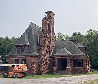 Bayside Cemetery and Gatehouse Complex is a historic cemetery and gatehouse located at Potsdam in St. Lawrence County, New York. The cemetery was established in 1865 and the gatehouse complex constructed in 1901. The gatehouse complex is a Châteauesque style, Late Victorian red Potsdam ashlar sandstone building. It includes a receiving room for the deceased and mourners, quarters for the cemetery custodial family, and a bell tower. The cemetery includes a number of notable structures and objects including the Clarkson mausoleum (1873), Morgan family obelisk, and Soldiers Monument (1903).[2]