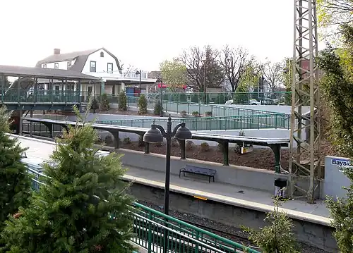 View of Bayside station house and pedestrian bridge from above the eastbound ramp. | |||||||||||