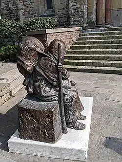 Be Welcoming is an interactive sculpture. The sculpture at first glance depicts a hooded figure, appearing to be a stranger, a traveler or a pilgrim. However, as the viewer walks around the sculpture and changes perspective, the figure is shown to be an angel with an outstretched hand motioning as if to invite the viewer to sit beside them.[3] The full sculpture includes the life-sized pilgrim-angel sculpture with a bronze bench large enough for an adult to sit upon.