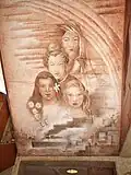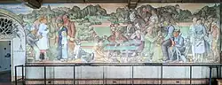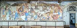 Lucien Labaudt painted the elaborate San Francisco Life fresco mural in 1936 and 1937.[5] The mural extends from the top of the wainscot to the ceiling of the first floor entrance lobby and wraps around all four walls, split into nine sections, each approximately 9 ft (2.7 m) tall and covering an aggregate area of 1,500 sq ft (140 m2).[10] It depicts real people and scenes from San Francisco in the 1930s, encompassing the beach, Golden Gate Park, Fisherman's Wharf, and the Marina District.[14]