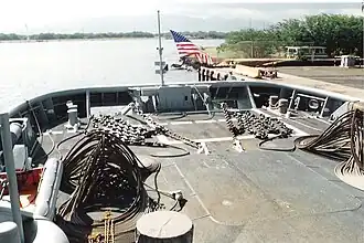 A common form of beach gear is to embed ship anchors on land or in water and attach them by cables, chains or ropes to other boats or ships. These can be attached to tugboats to increase their pulling power or to the stranded ship for pulling using its own winches.[1][2] US Navy standard beach gear is a ground tackle system consisting of anchors, chain, wire rope and heaving equipment. It is an engineered system designed to be used for developing a pulling force of up to 60 tons to retract stranded ships.[3]