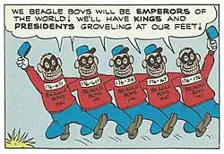 The Beagle Boys are a group of cartoon characters created in 1951 by Carl Barks for the Donald Duck universe. They are a family clan of organized criminals who constantly try to rob Scrooge McDuck.[2] Their introduction and first appearance was in "Terror of the Beagle Boys" (Walt Disney's Comics and Stories No. 134, November 1951), although in this story they only appear in the last frame and have no lines. They appear again in the next issue in a similar fashion, in The Big Bin on Killmotor Hill (Walt Disney's Comics and Stories No. 135, December 1951).