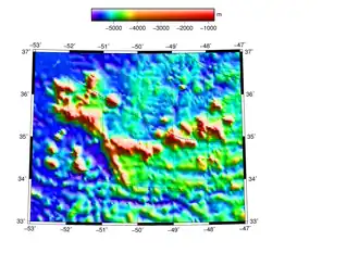 The Corner Rise Seamounts are a chain of extinct submarine volcanoes in the northern Atlantic Ocean east of the New England Seamounts. Both it and the New England Seamounts were formed when the North American Plate moved over the Great Meteor hotspot 75 million years ago.[1][2] It is the shallowest seamount in New England, with some of its nineteen highest peaks only 800–900 m deep.[3]