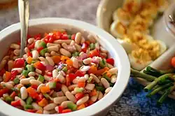 Bean salad is a common salad composed of various cooked beans—typically green, wax, kidney, and/or lima beans—tossed in a sweet-sour vinaigrette.[1] Variant ingredients include fresh raw onions, bell pepper, and/or other cooked or raw vegetables, such as chickpeas.[2]