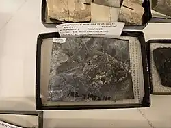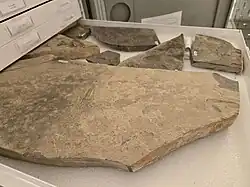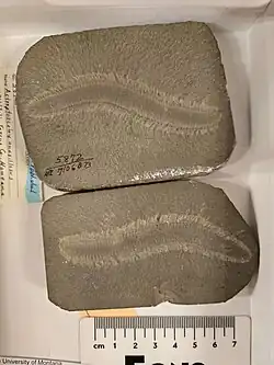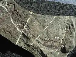 The Bear Gulch Limestone is a konservat lagerstätte, meaning that its fossils are uniquely well-preserved, including soft tissue details which offer rare insights into the biology of Carboniferous organisms.[2] The fine-grained sediments common in the formation allow for fossilized structures to retain fine resolution, as seen in equivalent plattenkalk-based lagerstätten throughout geological history. Most fossils are isolated and flattened into very thin films between sheet-like layers. Arborispongia assemblages, cephalopod shells, and large vertebrate bones occasionally project through several thin layers, approaching three-dimensional preservation.[14][15]