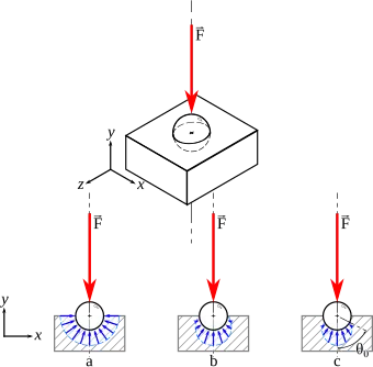 Bearing pressure is a particular case of contact mechanics often occurring in cases where a convex surface (male cylinder or sphere) contacts a concave surface (female cylinder or sphere: bore or hemispherical cup). Excessive contact pressure can lead to a typical bearing failure such as a plastic deformation similar to peening. This problem is also referred to as bearing resistance.[1]