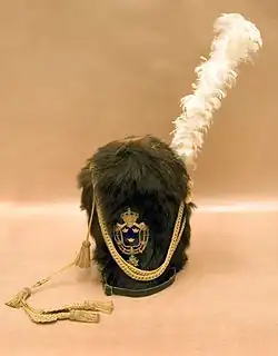The earliest record of a bearskin-like cap being worn by soldiers in Europe was during the mid-17th century, although its widespread adoption did not take place until 1761, when French grenadiers began to wear tall fur caps resembling the Prussian mitre cap.[2][3][4] The purpose appears to have been to add to the apparent height and impressive appearance of these troops both on the parade ground and the battlefield.[5] These fur caps developed into the large bearskin caps worn by the French Imperial Guard.[2] The British Grenadier Guards adopted the headdress after their victory at the Battle of Waterloo in 1815, with other British units and European militaries adopting the headdress in the years after.[2][3]