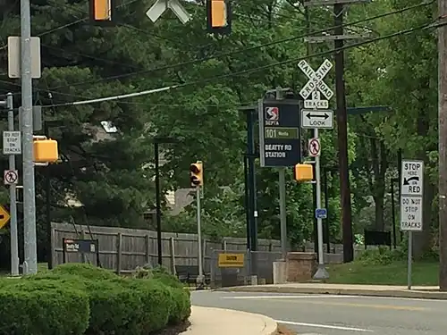 Beatty Road station is a stop on the D in Media, Pennsylvania. It is officially located on Beatty Road and Surrey Road, although the intersection of Beatty Road and Court House Road is much closer.