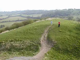 The remains found on the site show that it was originally an Iron Age fort[3] which gave the mount its ancient name, Donnilee.[4] The hilltop and the surrounding area was "sculpted" to form a motte and bailey fortification with its timber Hall following the Norman conquest.[5] It was followed by the construction of a stone castle. According to sources it was Thurston De Montfort who built the stone castle here in 1140 during the reign of Henry II,[6] and it remained the De Montfort seat for more than a hundred years.[7] Peter de Montfort also resided at the castle. The Earl of Warwick took possession of the De Montfort's land in approximately 1369, and subsequently the castle's importance declined. According to some accounts it was repaired in 1411 but later abandoned.[2] During the early years of the War of the Roses, between York and Lancaster, the castle, which was then unoccupied and had fallen into disrepair, was dismantled, and its heavy timbers were, according to some sources, used for the construction of stately houses at Henley.[8][9] A single stone and earthworks remain today, along with evidence of two fishponds and some remains of the motte and bailey fortification.[10]