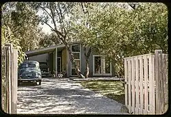 In that immediate post-war period modest architect-designed timber dwellings, and 'beach houses,' were erected in Beaumaris which have come to be styled collectively "Beaumaris Modern".[23] With rectilinear, box-like volumes and typically small-scale, they were usually single-storey, of light construction on a minimalist plan, with flat or raking roofs, broad eaves supported on timber beams left visible in interiors, and with painted fascias. Timber cladding between brick pylons or planar walls, left space for Mondrian-esque bays of timber-framed, often full-height windows or a Stegbar Window Wall of Boyd design. Garages were incorporated into the structure (often half-basement) or were in the form of simple, attached flat-roofed carports. Surrounding gardens in the fast-draining sandy soil were of indigenous plants amongst existing ti-tree, gums and banksia.