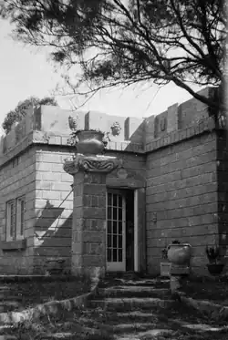 Michael O'Connell (1898–1976), a British soldier returned from the Western Front, between 1924 and 1926 built Barbizon (named after the French art school), on a bush block in Tramway Parade near Beach Road. The house was constructed from hand made concrete blocks on a simple cruciform plan and regarded by some as an early Modernist design.[85] It became a meeting place for Melbourne's alternative artists and designers including members of the Arts and Crafts Society. During the 1920s O'Connell focussed on School of Paris inspired textile design with his wife Ella Moody (1900–1981). Michael and Ella returned to England for a visit in 1937 but with the outbreak of war remained there and never returned to Australia. Barbizon was destroyed by the bushfire of 1944.[86]