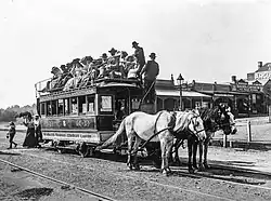 The Shire Council contracted the Beaumaris Tramway Company (BTC) in February 1888 for a horse tramway with a 30-year operating lease. The Sandringham to Cheltenham route cost £20,000 and opened that Christmas. At the February 1891, half-yearly meeting of the Beaumaris Tramway Company Limited the chairman Mr. H. Byron Moore reported that a recent doubling of traffic was coupled to the increasing popularity of cheap rail return tickets to Sandringham issued by the Victorian Railways,[35][36] nearly 17,000 of which had been issued.[37] Holiday-makers were offered moonlight tram rides during summer that year[38] and artists of the Victorian Sketching Club used the service.[39] The Mordialloc branch line was never built, and after the land boom bubble burst in 1891, development beyond Black Rock ceased for several decades. Holiday traffic kept the business afloat until in 1912 the Beaumaris to Cheltenham section closed, and in 1914, the BTC ceased operation.