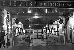 The Norman Edward Brotchie (1929–1991) pharmacy designed in the 1950s by architect Peter McIntyre featured boldly distinctive floor-to-ceiling coloured tile murals. The design by an unknown artist of overlapping cubist apothecary jars and bottles in yellow, brick-red, yellow and black covered sides of the facade and the interior walls of the premises at the southwest corner of Keys Street, Beaumaris. They were demolished during renovations in 2007.[23]