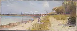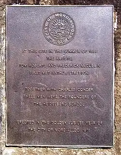 From the late 19th century Beaumaris and its coastal scenery attracted artists. Near Ricketts Point, there is a monument commemorating the first encounter of Arthur Streeton and Heidelberg school artists Tom Roberts,[83] and Fred McCubbin who rented a house over the summer of 1886/7. McCubbin later painted A ti-tree glade there in 1890.[84] Their associate, Charles Conder also painted idyllic scenes on the beach at Rickett's Point before he left for Europe in 1890. These paintings of Beaumaris are featured on plaques at the sites which they depict in the City of Bayside Coastal Art Trail.