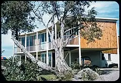 Beaumaris houses often incorporate bold experimentation in materials, forms and structural systems, such as Peter McIntyre's bowstring truss houses; influences of the Prairie School style of Frank Lloyd Wright and his contemporaries; extending to the 1970s in early examples of dwellings in the Brutalist style characterised by chunky forms with bold diagonal elements and raw concrete finishes first used in civic and institutional buildings in Australia from the mid-1960s and applied to domestic architecture such as the award-winning and now heritage-classified Leonard French House in Alfred Street, Beaumaris.[93] A long-time resident of Beaumaris, David Godsell was responsible for a number of buildings in the City of Bayside, the most important being Godsell's own 1960 house at 491 Balcombe Road, Beaumaris,[94] a multi-level Wrightian composition also included on the heritage overlay.[95] He also designed several buildings that were never built, including a remarkable Wright-influenced clubhouse for the Black Rock Yacht Club and a star-shaped Beaumaris house with a hexagonal module. Though, like many modernist homes in the district, several of his houses have been demolished since, surviving examples are simpler, more minimalist designs with planar face brick walls and floating flat roofs. Only the Grant House, 14 Pasedena Ave Beaumaris; the Godsell House, Balcombe Rd, Beaumaris; and the Johnson House, 451 Beach Rd Beaumaris, are under heritage protection.[96]
