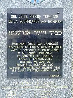 The Beaune-la-Rolande internment camp was a transit and detention facility[c] operated by French and German authorities in Nazi-occupied France during the Second World War. Built in 1939 to house German prisoners of war, it was repurposed after France's defeat in 1940 to detain French POWs. From 1941, it was used to intern foreign-born Jews living in the Paris region.[4] In May 1942, following the imposition of direct German control, mass deportations to extermination camps, primarily Auschwitz, began.[5] Among the victims were more than 1,500 children arrested during the Vel' d'Hiv Roundup and deported via Beaune-la-Rolande to Auschwitz, where most were murdered.[6]