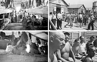 The first group of internees, primarily Polish Jews, arrived on 14 May 1941 following the Green ticket roundup.[20] French police had issued 6,500 summonses to Jewish men without French citizenship, aged 18 to 60, under the guise of a routine administrative check. Around 3,700 responded and were immediately arrested.[21] By October 1941, the camp held over 1,500 individuals of various nationalities, including Poles, Czechs, Austrians, Lithuanians and a small number of French Jews.[18] Prisoners were housed in 19 wooden barracks, surrounded by barbed wire and guarded by French gendarmes and auxiliary personnel.[22] Initially, limited contact with the outside world was permitted, including visits and parcels. The barracks were unfurnished except for straw bedding, and medical care was limited.[21]