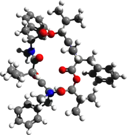 Beauvericin is a depsipeptide with antibiotic and insecticidal effects belonging to the enniatin family. It was isolated from the fungus Beauveria bassiana, but is also produced by several other fungi, including several Fusarium species;[1][2] it may therefore occur in grain (such as corn, wheat and barley) contaminated with these fungi.[2][3][4] Beauvericin is active against Gram-positive bacteria and mycobacteria, and is also capable of inducing programmed cell death in mammals.[2]