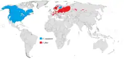 Carl Linnaeus coined the genus name Castor as well as the specific (species) epithet fiber for the Eurasian species.[5] German zoologist Heinrich Kuhl coined C. canadensis in 1820.[6] Many scientists considered both names synonymous for one same species[7][8] until the 1970s, when chromosomal evidence became available confirming both as separate where the Eurasian has 48 chromosomes, while the North American has 40. The difference in chromosome numbers prevents them from interbreeding.[9] Twenty-five subspecies have been classified for C. canadensis, and nine have been classified for C. fiber.[5][6]