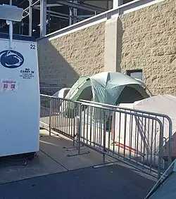 Starting with the October 2005 game against Ohio State, students have camped out outside Gate A to obtain good seats for home games; "Nittanyville" is a recognized university club with rules of conduct.[6] It was originally known as "Paternoville". During whiteout games, a special week-long camping starts on Monday instead of the usual Wednesday or Thursday.