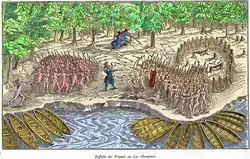 In 1610, Champlain and his French companions helped the Algonquins and the Hurons defeat a large Iroquois raiding party. In 1615, he joined a Huron raiding party and took part in a siege on an Iroquois town, probably among the Onondaga south of Lake Ontario in New York. The attack ultimately failed, and Champlain was injured.[10]