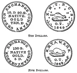 Beaver Coins, also known in pioneer days as Beaver Money, were gold coins minted in Oregon in 1849. Their name comes from the prominent beaver depicted on the obverse of the coins. The currency contained 8% more gold than contemporary coins from the United States of America.[1] Today these coins are quite rare and valuable.[2]