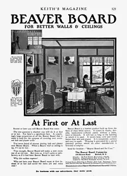 Beaverboard (also beaver board) is a fiberboard building material, formed of wood fibre compressed into sheets. It was originally a trademark[1] for a lumber product built up from the fibre of clean white spruce[2] made from 1906 until 1928 by the Beaver Manufacturing Company at their plant in Beaver Falls and marketed from their headquarters on Beaver Road, in Buffalo, New York.