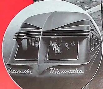 ![]() An advertisement depicts a third-generation Beaver Tail car on the rear of the Midwest Hiawatha in the 1940s. | |