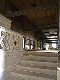 Stairs up to the monks' sleeping quarters; at the end of the hall is Lustnau's Gothic window