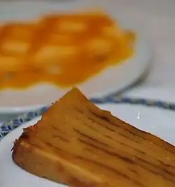 Bebinca or bebinka, (Konkani; bibik) is a layer cake of Indo-Portuguese cuisine in former Estado da Índia Portuguesa, Goa. In traditional baking, a bebinca has between 7 and 16 layers, but bakeries can modify the cake recipe as per convenience and taste.[1][2] It is especially popular during the Christmas season, but is available all year round due to tourism in Goa.[3][4] It is also easily available to carry and preserve for a long time or eaten fresh.