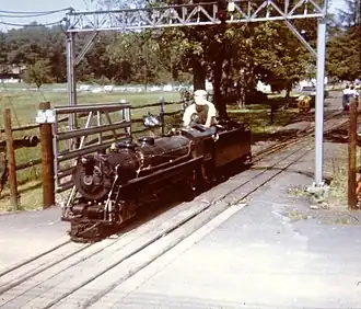 At full operation, the railroad ran on Saturdays until 5 pm between the beginning of May and the end of October, including Memorial Day, the Fourth of July, and Labor Day. It also operated on Wednesdays during July and August until dusk. It provided a two-mile (3 km) round-trip ride between Centerville and Peachtree Jct. Originally, a round-trip ticket cost 20 cents for children and 40 cents for adults (later raised to 24 and 48 cents, respectively, during the early 1960s, and to 25 and 50 cents, respectively, by the late 1960s).[1] Typically, #1501, a 4-8-4 live steam locomotive, would pull a train on the hour (10 am, 11 am, noon, etc.) and #1502 or #1503 (miniature diesel locomotives) would run on the half-hour (10:30 am, 11:30 am, etc.). Six to eight passengers could ride per car, and trains usually ran with 8-10 cars. On rare occasions, if ridership warranted, #1500 (a smaller 0-4-0 diesel engine) would be called to run as an "extra" with a shorter consist of cars (usually no more than four cars) on the quarter-hour.