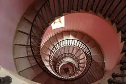 Standing 154 feet (47 m) high,[30] the tower has three stages. The first stage is square with small windows and terminates in a Doric entablature and cornice. The second stage has plain square piers forming three openings with recessed arches.[30] The tower is topped by a gilded lantern (or belvedere), based on the peripteral temple at Tivoli and the Tower of the Winds at Athens.[31] The octagonal belvedere has a cast iron roof supported by eight columns.[32] A stone spiral cantilevered staircase leads to the 53 wooden stairs giving access to the cupola at the summit.[30] At the base of the tower was a furnace and pump which sent warm air up through the structure.[11]