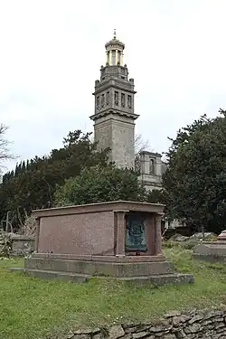 Part of the grounds were donated to the local parish after Beckford's death and consecrated as a cemetery in 1848.[2] It became known as Lansdown Cemetery and burial plots were laid out in a grid pattern.[2] It was extended in 1947 and again in 1961.[40] In addition to Beckford's tomb, the cemetery is also the burial site for several notable people from Bath, including Henry Goodridge,[41] Field Marshall William Rowan, the Holburne family who founded the Holburne Museum, Anne (the wife of Sir Richard Bickerton, 2nd Baronet) and the feminist writer Sarah Grand.[42]