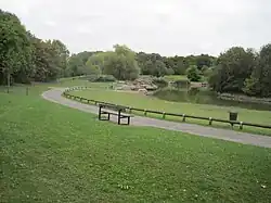 The south-eastern part is a large grassed area with football pitches, a children's playground and a small pond. North-west is a hilly area managed for nature conservation with a wildflower meadow and woods.[5]