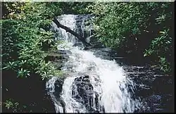 Becky Branch Falls is a twenty-foot waterfall located in Rabun County, Georgia. The waterfall is located on the Bartram Trail (designated as a National Scenic Trail in Georgia) [1] in a valley called Warwoman Dell, east of Clayton, Georgia. In addition to accessing the falls via the Bartram Trail at the point where the trail crosses Warwoman Road, there is a short 0.6 mile loop trail called Becky Branch Falls Trail. This alternative trail connects is also accessed at the point where the Bartram Trail crosses Warwoman Road. The Bartram Trail also continues to nearby Martin Creek Falls. Becky Branch Falls is located within the boundaries of the Chattooga River Ranger District of the Chattahoochee National Forest.