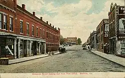 Bedford was laid out as a town and the county seat of Lawrence County, Indiana, United States in 1825.[4] The original county seat was in Palestine, four miles to the south, but was moved, at the urging of the legislature, to a new location as the original location near the White River was deemed unhealthy because of malaria spread by mosquitoes.[5][6] The new site was named Bedford at the suggestion of a prominent local businessman, Joseph Rawlins, who had relocated to the area from Bedford County, Tennessee.[7] It incorporated as a town in 1864 and received its city charter in 1889.[8] Bedford was a stop on the Underground Railroad.[9]