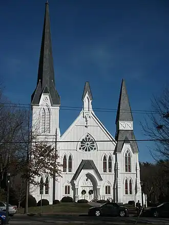 an 1872 newcomer, a whitewashed eccentricity with unmatching towers, an unexpected rose window and, within, amen pews flanking the pulpit.[3]