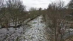 In 1984, a replacement station was opened in the former freight yard, at the north end of the triangle, which enabled services to continue to Bedford Midland. The new connection runs over the route of the Midland's Hitchin line, which closed in 1964.[10] The old station site was abandoned, although some of the furniture, such as the lampposts, was not removed. The site has now been reclaimed by nature.[11][12]