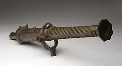 Bedil is a Maritime Southeast Asian term that refers to various types of firearms and gunpowder weapons, ranging from small pistols to large siege guns. The term bedil comes from Tamil wedil (or wediyal) and wediluppu (or wediyuppu).[1] In their original form, these words refer to gunpowder blast and saltpeter, respectively. After being absorbed into bedil in the Malay language and in a number of other cultures in the archipelago, Tamil vocabulary is used to refer to all types of weapons that use gunpowder. The terms bedil and bedhil are known in Javanese and Balinese. In Sundanese the term is bedil, in Batak it is known as bodil, in Makassarese baddilik, in Buginese, balili, in Dayak language, badil, in Tagalog, baril, in Bisayan, bádil, in Bikol languages, badil, and in Malay it is badel or bedil.[1][2][3]