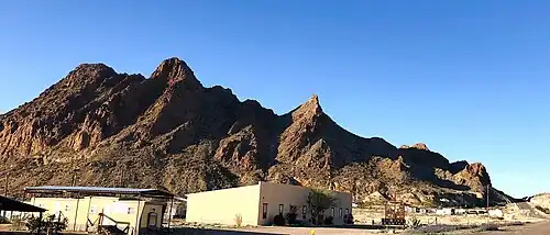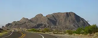 Bee Mountain is set the Chihuahuan Desert less than two miles outside the boundary of Big Bend National Park where it is a landmark seen from Highway 118 which skirts the eastern base of the peak. The mountain is a soda microsyenite volcanic plug which formed 34 million years ago when it intruded three Late Cretaceous marine sedimentary formations which included the Boquillas Formation and the Pen Formation.[6] Based on the Köppen climate classification, Bee Mountain is located in a hot arid climate zone with hot summers and mild winters.[7] Any scant precipitation runoff from the mountain's slopes drains to the Rio Grande via Bens Hole Creek and Terlingua Creek.[2] Although modest in elevation, topographic relief is significant as the summit rises 860 feet (262 m) above Bens Hole Creek in 0.35 mile (0.56 km). The mountain's toponym has been officially adopted by the United States Board on Geographic Names,[4] and has been listed in publications since at least 1904.[1] The name is attributed to native bees which would build their once numerous hives in crevices on the sides of the mountain before settlers eventually destroyed them to collect honey.[8]